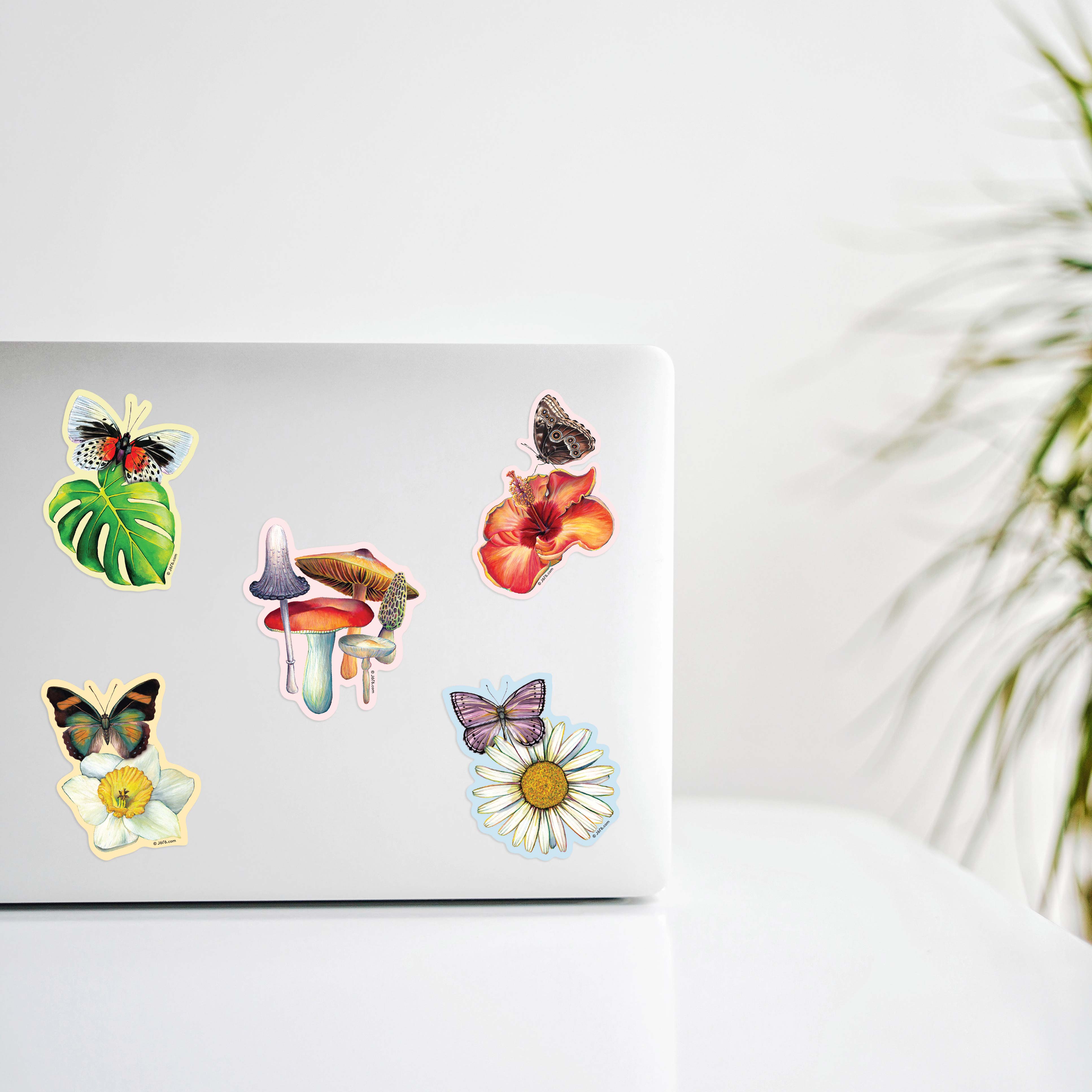 This playful design pairs a vibrant happy flower with a purple butterfly set against a cheerful blue background, creating a lively and whimsical nature scene. Perfect for personalizing laptops, water bottles, cars, notebooks, and more.