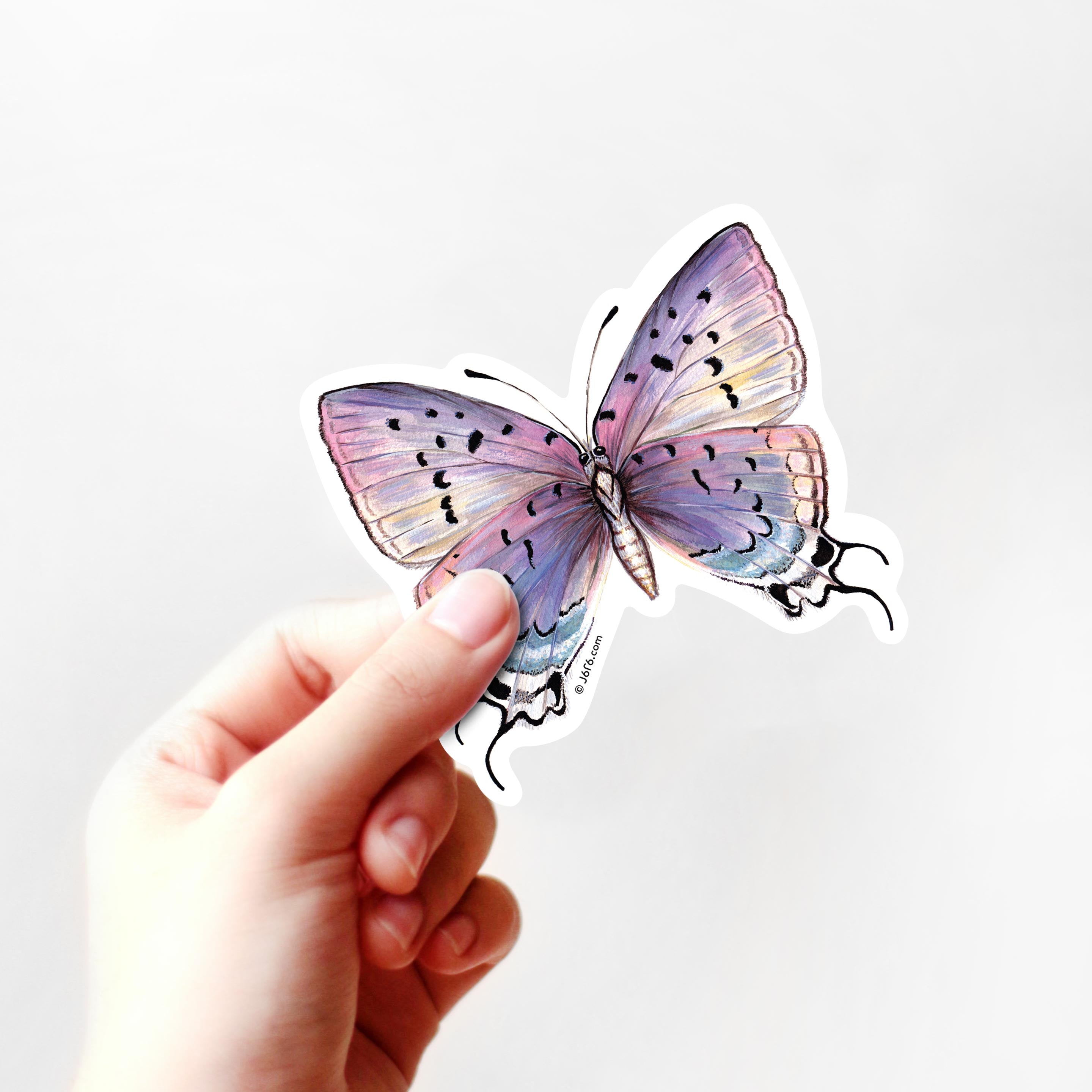 Colorful, creative, and smile-inducing premium vinyl stickers feature J6R6 artwork that is hand painted in house and designed to make you feel sunny. This purple verso hairstreak butterfly decal is perfect for customizing your water-bottle, car, laptop, etc.